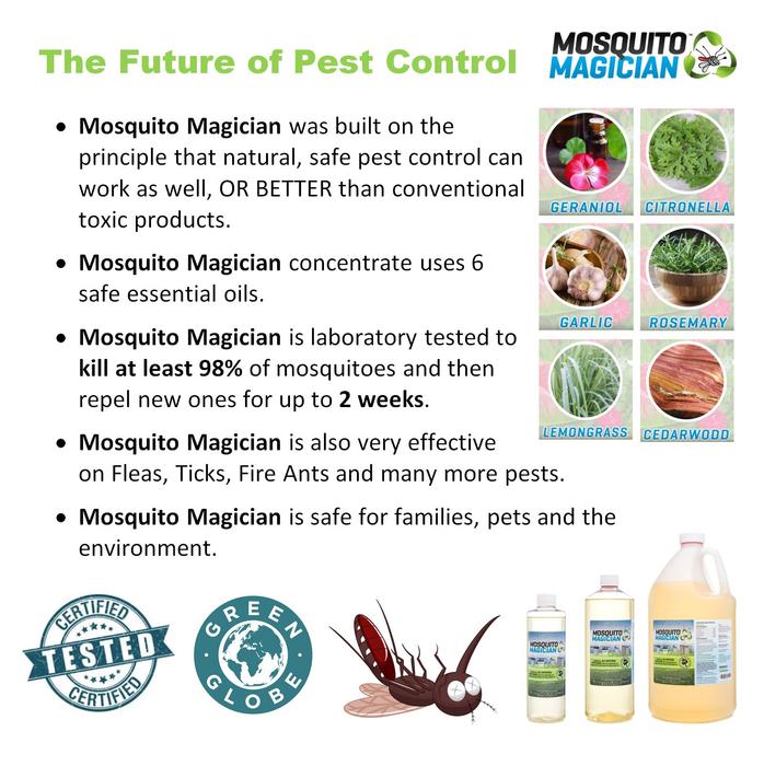 Mosquito Magician concentrate is the best-in-class product for natural pest control. It is extremely potent and used by thousands of families every day to kill and repels mosquitoes, fleas, ticks, fire-ants, as well as many other biting pests. Best part is it's also 100% safe for kids, pets and the environment. We have done independent laboratory testing and Mosquito Magician concentrate will kill at least 98% of mosquitoes and will then repel new ones for 1-2 weeks.